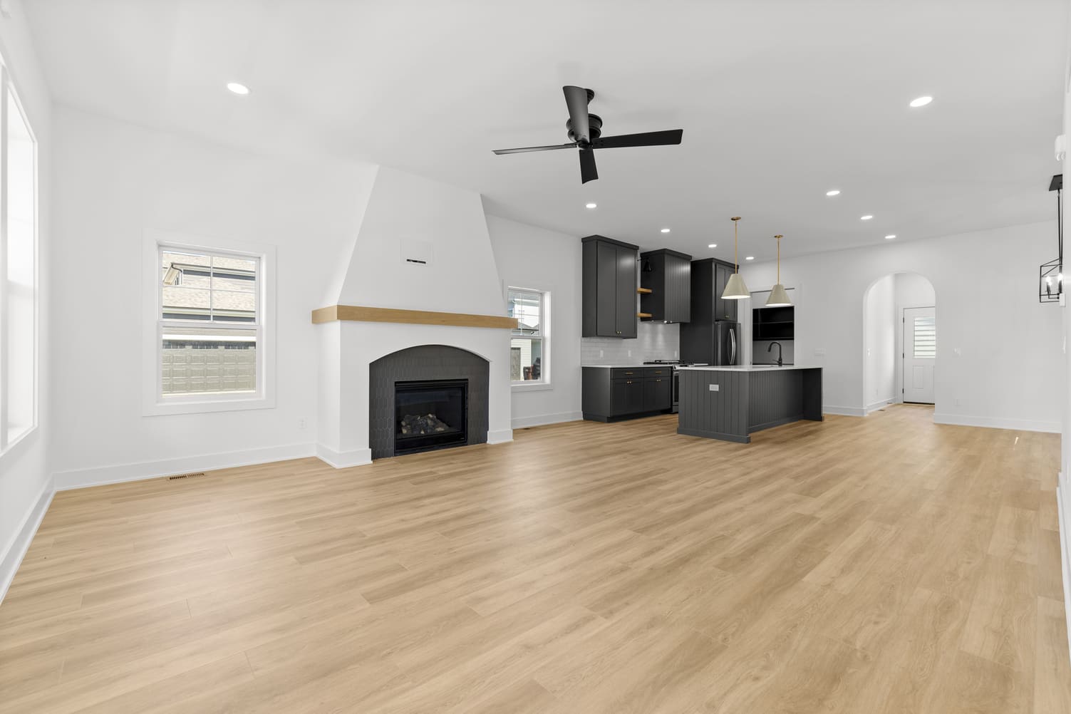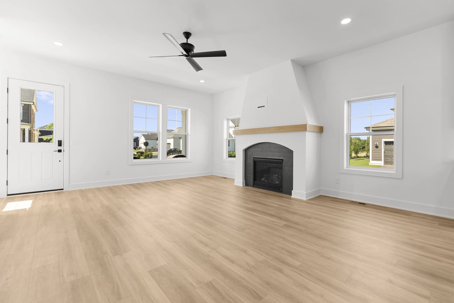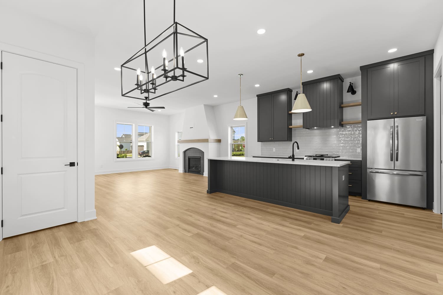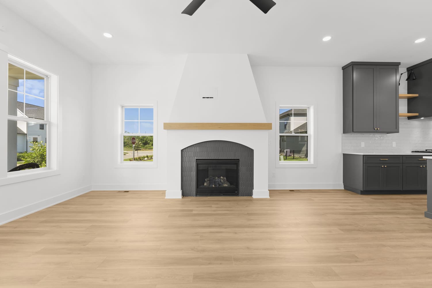 Inside, sunlight fills an open layout with rich wood flooring, a statement fireplace, and a well-appointed kitchen. From the mudroom to the powder bath, every space is built with care, quality materials, and thoughtful design choices that make everyday living feel special.